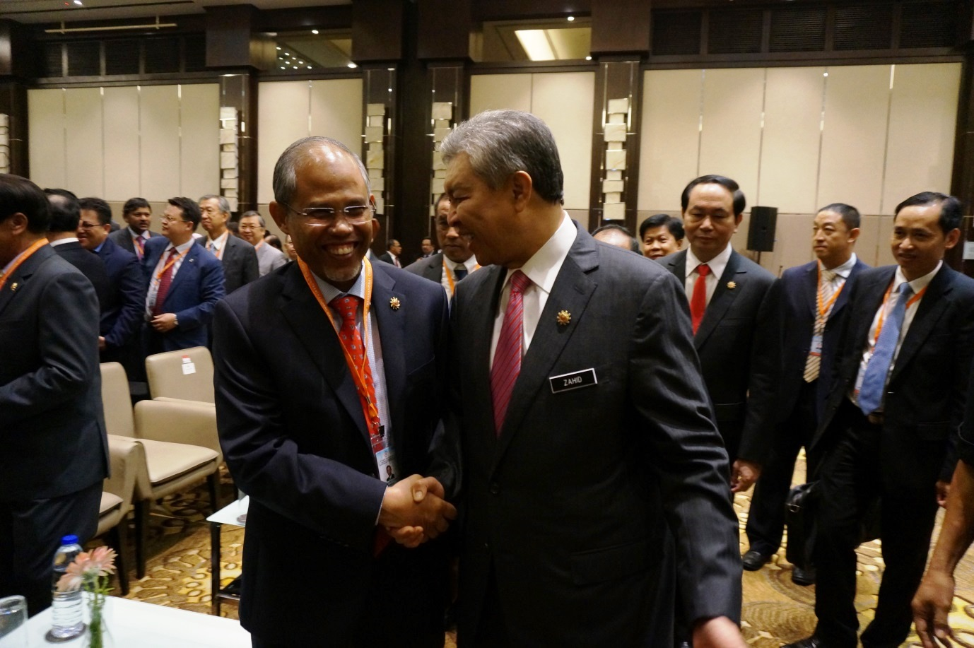 Second Minister for Home Affairs and Foreign Affairs Masagos Zulkifli shaking hands with Malaysian DPM and Minister of Home Affairs Dato Seri Dr. Ahmad Zahid Hamidi at the 10th ASEAN Ministerial Meeting on Transnational Crime in Kuala Lumpur, Malaysia.
