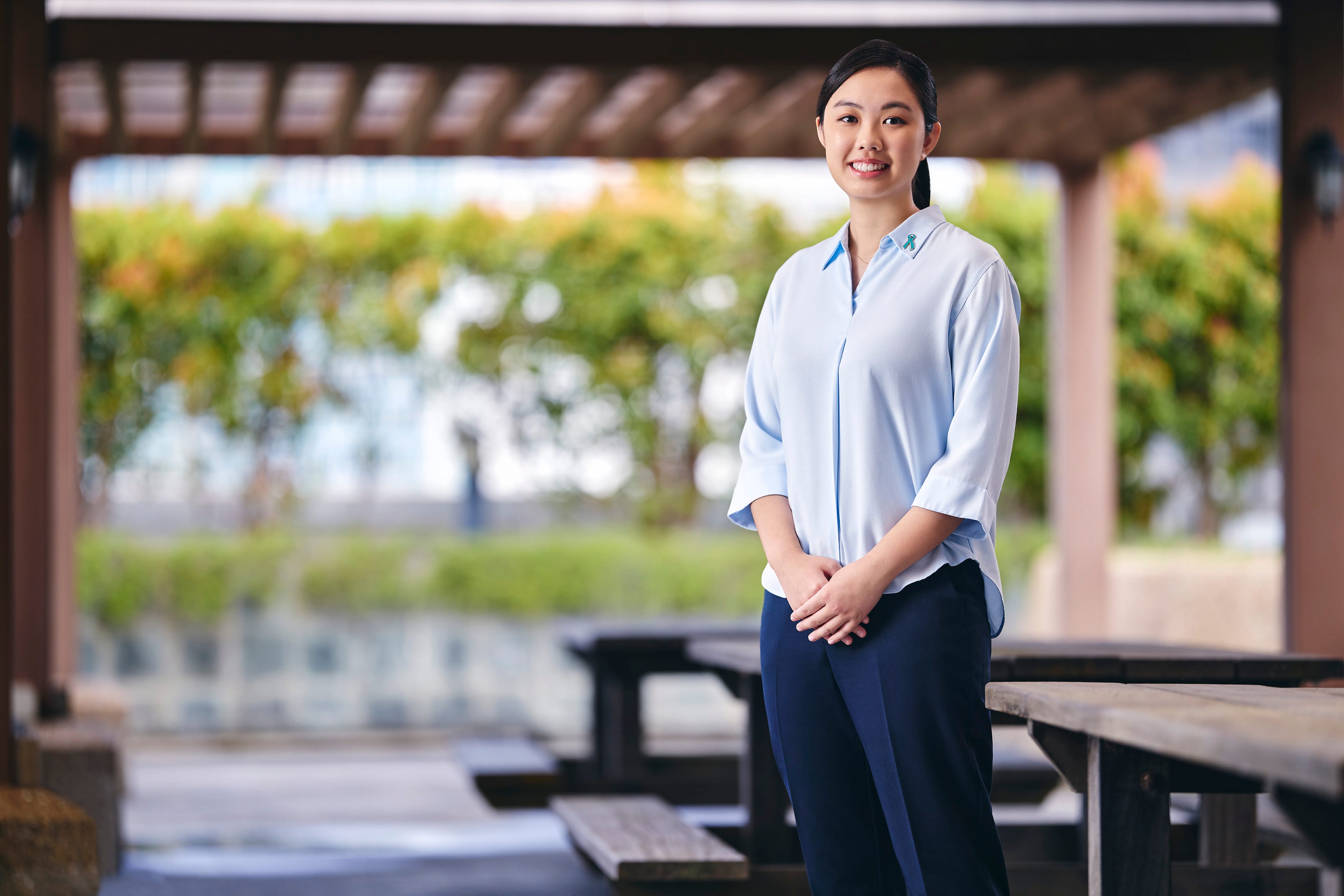 Smiling woman in light blue blouse and navy pants stands outdoors with picnic tables.
